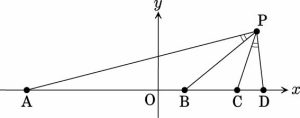 $xy$ 平面において,異なる 4 点 A, B, C, D が左から順に $x$ 軸上にあるとします(例えば,A$(-5,0)$, B$(1,0)$, C$(3,0)$, D$(4,0)$など).このとき,$x$ 軸上にはない点 P で,線分 AB を見込む角と線分 CD を見込む角が等しい点,すなわち,$\angle\t{A}\t{P}\t{B}=\angle\t{C}\t{P}\t{D}$ をみたす点 P の集合はどのような図形になりますか.できれば,その図形の作図方法も述べてください.作図方法はできるだけエレガントなものを望みます.また,さらにできれば,両線分を見込む等しい角の大きさが最大となる点を見つけてください.