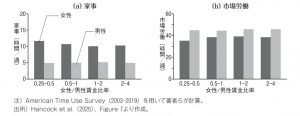 予測 1 に対して、本論文では「男性の家事時間は家計内の相対賃金に対してきわめて非弾力的である」という点を実証的に指摘する。図 2 は、図 1 と同様のデータを用いて、共働きの異性カップルにおける相対賃金と (a) 家事時間、(b) 市場労働時間の関係を示している。これをみると、男性は相対賃金が変化しても、時間配分はほとんど変化させていないことがわかる。一方で、女性は相対賃金の上昇に応じて家事時間を減少させる傾向がみられるものの、常に男性より多くの家事を担っている。男性が家事を代替しない限り (市場へのアウトソーシングが一部可能でも) 女性の家事時間を減らし続けることには限界があるのだ。