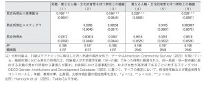 表 1 は、女性が潜在的な配偶者よりも多く稼ぐ可能性が高い婚姻市場に居住し、かつ出身国における家事配分が女性に偏っている場合に、異なる人種・文化的背景を持つ男性との婚姻、あるいは婚姻しないことを選択する確率が高まることを示している。さらに、稼得能力の高い女性に対するスティグマの影響を検討するために、出身国において「女性が夫より多く稼ぐと問題が生じる可能性が高い」と考える 18 歳以上の人口割合を、女性が高所得であることに対するスティグマとして用いた分析も行われているが、統計的に有意な影響はみられない。これらの結果は、女性の相対的稼得力が高い状況において、家事分担が不均等な文化的背景を持つ移民女性ほど、異なる人種・文化的背景を持つ男性と婚姻あるいは婚姻の先送りを行うのは、スティグマではなく婚姻後に期待される家事配分に起因する可能性を示唆している。