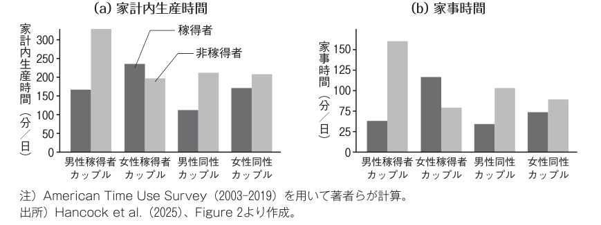図1 は、アメリカの生活時間調査 (time use servey) を用いて、稼得者と非稼得者の家計内生産時間および家事時間2)をカップルタイプ別に示している。分業仮説に基づけば、稼得者は非稼得者よりも家計内生産や家事に費やす時間が少なくなると予想される。実際、多くのカップル類型においてこの関係が確認される一方で、女性が稼得者である異性カップルにおいてのみ、この関係は観察されない (図1 (a) 参照)。