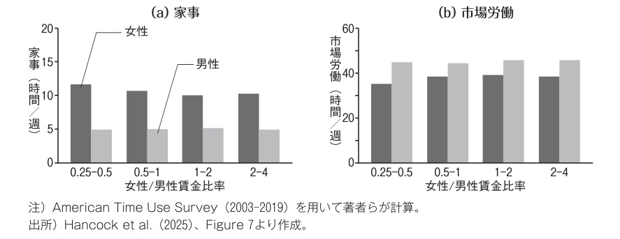 本稿では、女性の稼得能力が高まる中で、家事時間を女性から男性へと再配分することが容易ではないことを実証的に示し、家事配分にジェンダー的要因が存在する可能性を提起した Hancock et al.(2025) を紹介した。本論文の分析からは、男性の家事労働が非弾力的である結果として女性が家事労働を担い続けることになり、女性の市場労働供給における制約となりうること、さらに、稼得能力の高い女性は家事労働に積極的ではない男性との結婚を忌避しうることなど、家事労働の配分が労働市場や婚姻行動に波及的影響を及ぼしうることが示唆されている。女性の労働参加率や男女賃金格差、婚姻率といったマクロ変数を理解するうえで、重要な示唆を与える興味深い論文である。