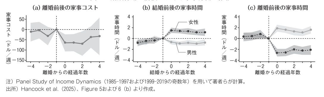 図 3 (a) は、アメリカの代表的な家計パネル調査である PSID (Panel Study of Income Dynamics) を用いたイベントスタディにより、異性カップルの離婚前後における家事コストの変化を示している。先述の通り分業仮説に基づけば、婚姻においては家計内生産に規模の経済が存在し、分業も可能となるため、家計内生産に要する総コストは独身や離婚状態よりも低くなる、あるいは少なくとも上昇はしないと予測される。しかし、図 3 (a) が示すように、実際には離婚後の方が家事コストが低下している。この結果は、婚姻中の家事配分が非効率的であったことを示唆する。