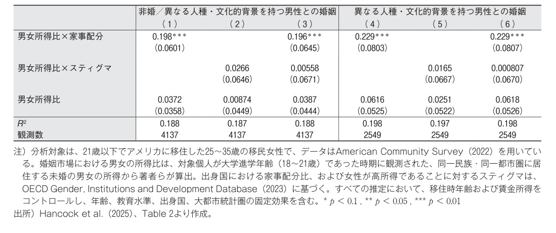 表 1 は、女性が潜在的な配偶者よりも多く稼ぐ可能性が高い婚姻市場に居住し、かつ出身国における家事配分が女性に偏っている場合に、異なる人種・文化的背景を持つ男性との婚姻、あるいは婚姻しないことを選択する確率が高まることを示している。さらに、稼得能力の高い女性に対するスティグマの影響を検討するために、出身国において「女性が夫より多く稼ぐと問題が生じる可能性が高い」と考える 18 歳以上の人口割合を、女性が高所得であることに対するスティグマとして用いた分析も行われているが、統計的に有意な影響はみられない。これらの結果は、女性の相対的稼得力が高い状況において、家事分担が不均等な文化的背景を持つ移民女性ほど、異なる人種・文化的背景を持つ男性と婚姻あるいは婚姻の先送りを行うのは、スティグマではなく婚姻後に期待される家事配分に起因する可能性を示唆している。