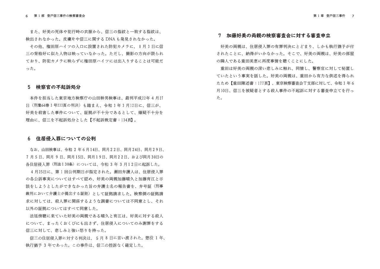証拠もすべて著者らが作成し、さらに、検察官経験者によってその証拠に基づき実際に「不起訴裁定書」を作成してもらった。加藤好美両親の「審査申立書」も、実際に代理人弁護士として委任を受けた場合に考えるであろう内容を想定して作成してみた。また、審査補助員経験者に、登戸信三事件を審査するための「審査事項検討表」を作成してもらった。そのうえで、仮想の検察審査会の審査状況を再現した。そして最終的には、本件検察審査会での一定の議決を想定し、「審査議決書」および「審査議決の要旨」を作成したものとなっている。