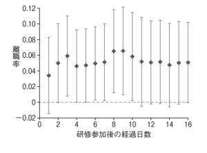 図 1 は,DYP 研修が離職に与える影響 (LATE) を,研修参加後 1 カ月から 16 カ月までの経過月数ごとに推定した結果を示している.具体的には,「研修後 $E$ カ月以内に離職したか」というダミー変数を作成し,各 $E\in\{1,2,\dots,16\}$ について別々に操作変数推定を行って,得られた推定値をプロットしたものである.見てわかる通り,DYP 研修を受けた従業員の離職率が $4\sim 6\%$ ポイントほど高まっている.統制群における年間平均離職率が $13.2\%$ であるとのことなので,DYP研修により離職率が $40\%$ 増加していることに相当し,効果の規模が大きいことわかる.推定値は 16 カ月後までおおむね安定しているが,このことは,「いずれにせよ離職していたであろう人たちの離職を早めた」というよりは「DYP 研修がなければ離職していなかった人たちの離職を促した」と解釈できる.この実証結果は,予測 1 と整合的だ.
