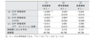 (5)式の $\beta_2$ は処置意図効果 (Intention-to-Treat Effect: ITT) となる.表 1 の行 (a) は ITT の推定値を示している.研修招待を受けた従業員は低業績者に分類される確率が $2.6\%$ ポイント下がり,その分,標準業績者に分類される確率が同等に増加していることがわかる.次に,$P_i$ を従業員 $i$ が実際に DYP 研修に参加したかどうかを表すダミー変数として,(5)式の $T_i$ を $P_i$ にすげ替えたうえで $T_i$ と $\t{Post}_i\times T_i$ を操作変数として用いて LATE を推定した結果が表 1 の行 (b) だ.LATE が ITT より大きくなることは定義より自明だが,DYP 研修参加により遵守者について低業績者に分類される確率が $5.3\%$ ポイント下がり,統制群における平均と比べると約 $51\%$ もの効果に相当することがわかる5).