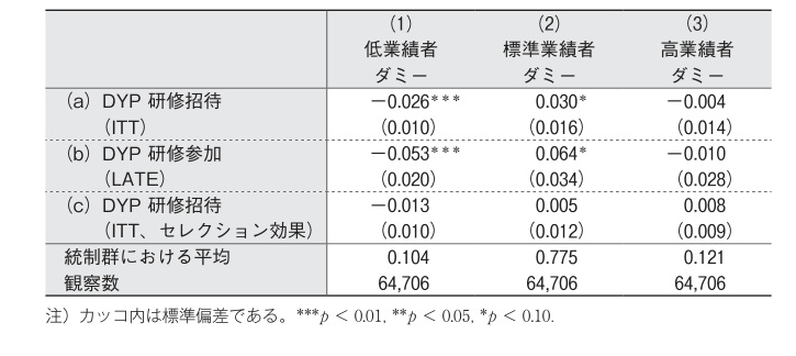 (5)式の $\beta_2$ は処置意図効果 (Intention-to-Treat Effect: ITT) となる.表 1 の行 (a) は ITT の推定値を示している.研修招待を受けた従業員は低業績者に分類される確率が $2.6\%$ ポイント下がり,その分,標準業績者に分類される確率が同等に増加していることがわかる.次に,$P_i$ を従業員 $i$ が実際に DYP 研修に参加したかどうかを表すダミー変数として,(5)式の $T_i$ を $P_i$ にすげ替えたうえで $T_i$ と $\t{Post}_i\times T_i$ を操作変数として用いて LATE を推定した結果が表 1 の行 (b) だ.LATE が ITT より大きくなることは定義より自明だが,DYP 研修参加により遵守者について低業績者に分類される確率が $5.3\%$ ポイント下がり,統制群における平均と比べると約 $51\%$ もの効果に相当することがわかる5).